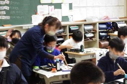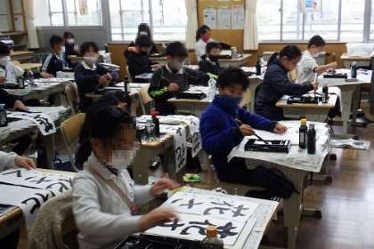 写真は4年生の書写の様子です。今年の書初めは、「花さく里」です。漢字とひらがなが混ざった言葉ですが、バランスに気を付けて各必要があります。講師の先生のご指導を受けながら、集中して取り組むことができました。