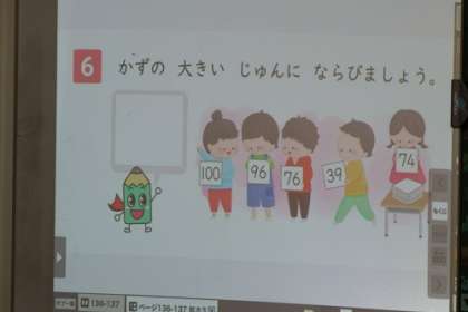 算数「大きいかず」で、数字を数の大きい順に並べる学習に取り組みました。まずは、十の位の数を比べ、その後、一の位の数を比べます。
