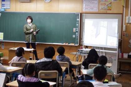 学区探検では、たくさんの発見がありました。みんなで共有するために、探検で撮ってきた写真を使って振り返ります。「あった、あった」なんて声も聞かれます。