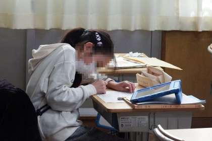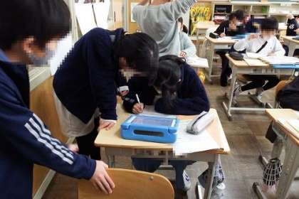 国語で「食」をテーマにしたリーフレットづくりに取り組んでいます。中テーマを決め、イメージを書き出し、調べ学習に入ります。魅力的なリーフレットを。