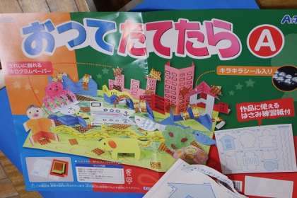 図工「おってたてたら」で、紙をおって立て、楽しい町を作ります。ホログラムペーパーやキラキラシールも使って、自分だけの町の完成を目指します。