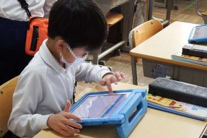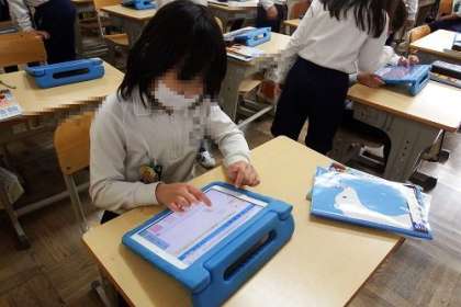 算数「三角形と四角形」の学習です。学習した三角形や四角形を使って、模様作りを行いました。タブレットを使って模様を作り、みんなの前で発表しました。