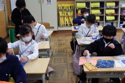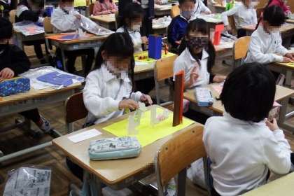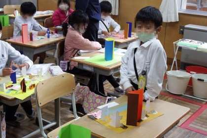 図工「おってたてたら」の作品が完成に近づいてきました。ビルをつくったり、生き物を貼り付けたり、自分の町をつくりあげました。