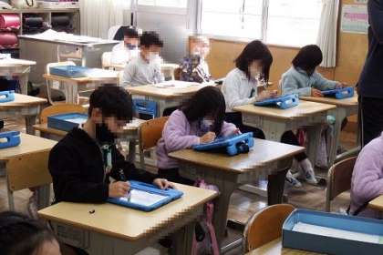 算数の学習で、タブレットを使っておさらいをしました。写真は、三角形の問題を解いている様子です。三角形や四角形の条件は、何だったかな。