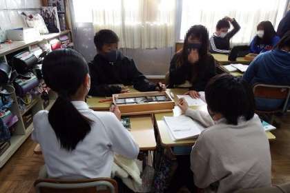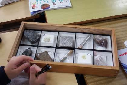 理科「土地のつくりと変化」の単元で、火山噴火によってできた地形について学習しました。火山から出てきた砂や土の見本を見ながら、その様子について話し合いました。