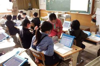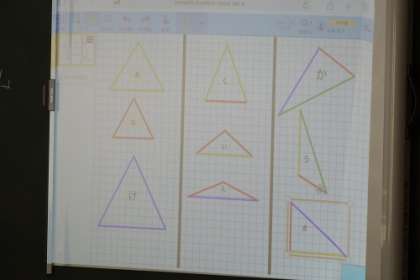 算数「三角形」の学習に入りました。今日は、いろいろな三角形を仲間分けします。辺の長さに着目して、二等辺三角形や正三角形を見つけ出します。