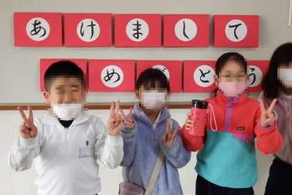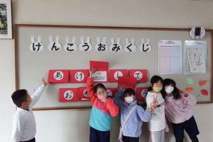 1月の保健掲示板は、「けんこう おみくじ」です。掲示板に備え付けてあるおみくじを引いて、「あけましておめでとう」のカードをめくると、自分が健康に気をつけるべきポイントが描かれています。さて、今年の健康運は?