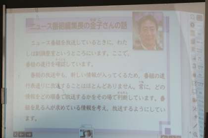 テレビなどの情報産業とわたしたちのくらしについて学習しています。ニュース番組をつくるためには何が必要で、どのように作られるのか。番組を作っている人々の話をもとにしながら、学びを深めています。