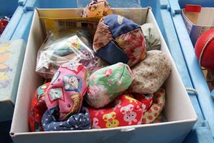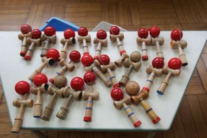 けん玉、だるま落とし、カルタ、お手玉など・・・。生活科で「むかしあそび」の体験をしています。広場には、昔遊びのための道具が。