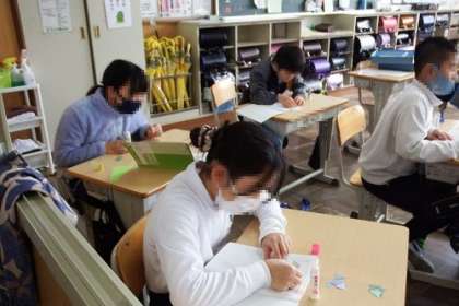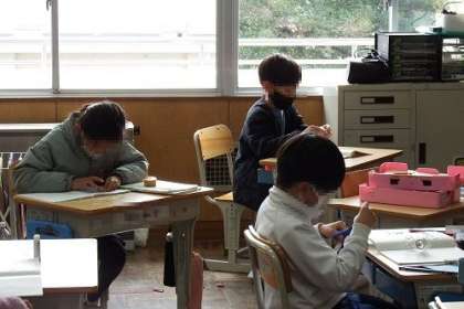 算数「三角形」の学習で、正三角形や二等辺三角形をしきつめて模様づくりを行いました。できあがった模様の中にも、正三角形や二等辺三角形ができあがることに気付きました。
