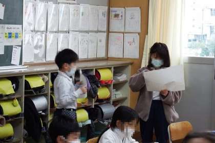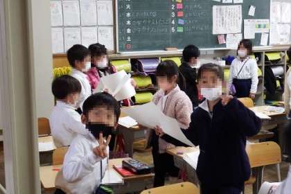 国語「おはなしをかこう」の学習の様子です。昔話のようにお話に出てくる人物を考え、自分だけのお話を作りました。面白そうな話がいっぱいです。みんなで楽しく読み合いました。