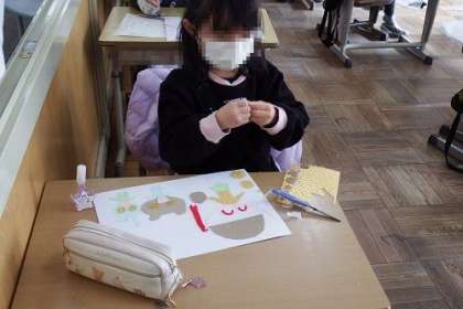 版画「〇〇しているぼく わたし」に取り組んでいます。厚紙やビニール、ひもなど巣材を生かしながら、構成を考え工夫しているところが素晴らしいです。