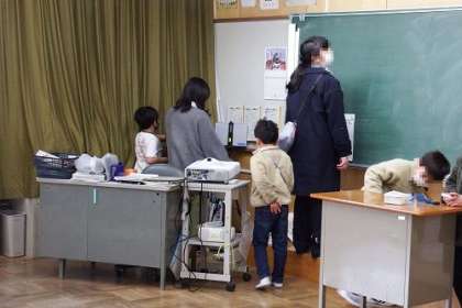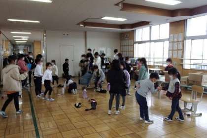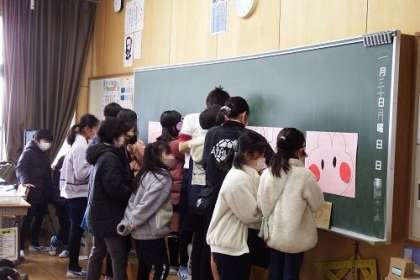 的当てゲームや絵しりとり、新聞を使った文字探し、福笑い、宝探し、ビー玉運び、紙コップ積み・・・・、子どもたちのアイディアあふれるゲームやクイズが、校内のあちこちで行われました。みんなの笑顔があふれる時間となりました。