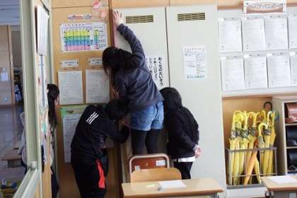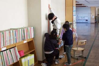 算数「100センチメートルをこえる長さ」の学習で、教室や廊下にあるいろいろな物や場所の長さをはかりました。1メートルものさしや紙テープを使い、協力しながらはかっていきます。今まで何となく見ていた窓や黒板も、見方が変わるかも。