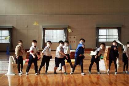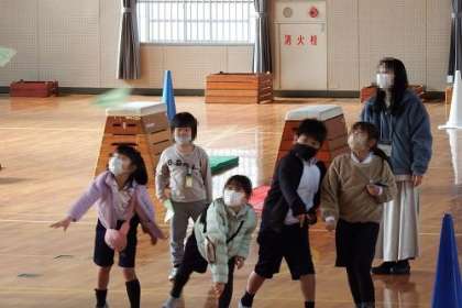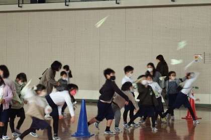 イベントママさんの企画「紙飛行機をとばそう」が人気です。写真は、2年生の様子です。少しでもたくさん投げようと、紙飛行機を投げては、走って回収し、また、投げる。子どもたちが元気に活動しています。
