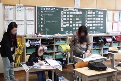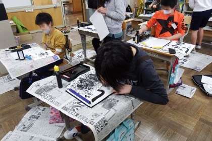 毛筆で「もみじ」の文字を書きました。ひらがなのやわらかく曲がる線の筆遣いが今日のテーマです。何度も何度も納得するまで練習を繰り返すことができました。