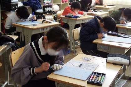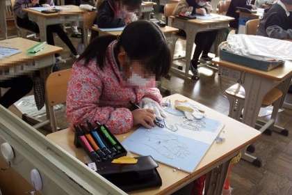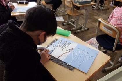 木版画にトライしています。安全に掘り進められるように、彫刻刀の扱いに気をつけています。木版画の良い風合いを味わえるようにしたいです。作品は、自分の手を描いています。手の形やしわの入り方までよく見ながら。