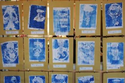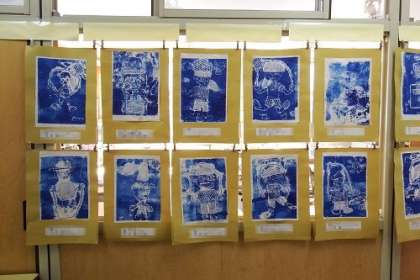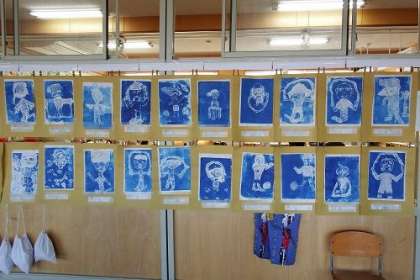 2年生が図工の学習でつくった版画を教室に掲示しています。水色で印刷された版画は、とてもさわやかで鮮明です。子どもたちの夢の世界が広がります。写真は、2年3組、4組、5組の様子です。