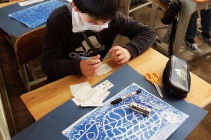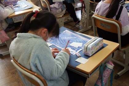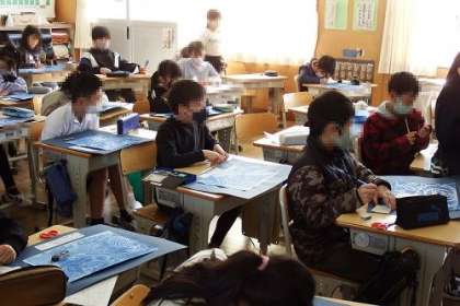図工で取り組んできた版画が完成しました。今日は、鑑賞会です。青く色刷りされた宇宙のデザインが鮮やかです。お互いの作品を見合いながら、よい所や素敵な所を伝えました。
