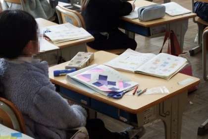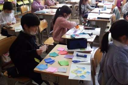 算数の復習を行っています。この日は、かたちの学習で、色紙を使いました。色紙を切って並べ、いろいろな形ができあがりました。形の概念をつくっていきます。