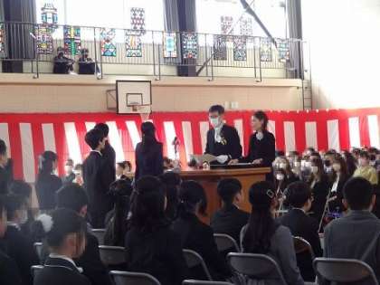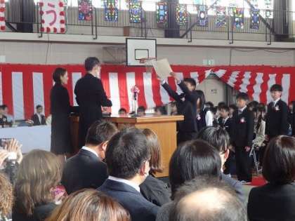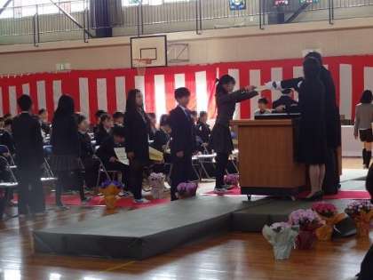 卒業証書が一人ずつに手渡されます。子どもたちの「はい」という返事が、体育館に響き渡ります。