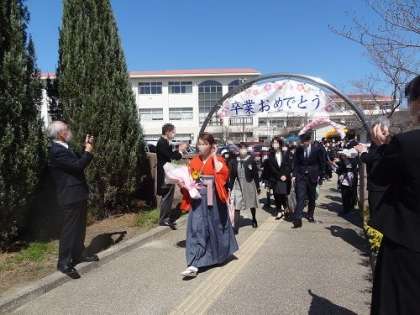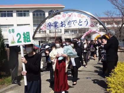5年生が花道を作る中、最後の門出送りです。6年前、お家の方に手をひかれくぐった門を、自分の足で歩きながら出ていきます。子どもたちの顔がとても晴れやかでした。素敵な卒業式をありがとうございました。