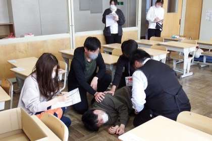 学校にとって、子どもたちの命を守ることは、第1に考えなければなりません。そこで、子どもたちが登校する前の本日、事故対応のシミュレーション研修を行いました。アナフイラキシーショック症状が起きたという設定で、発生時の救命措置、救急隊への連絡、保護者連絡、エピペンやAEDの使用などを研修・確認しました。