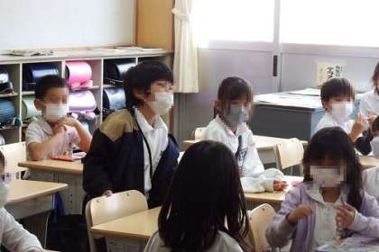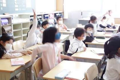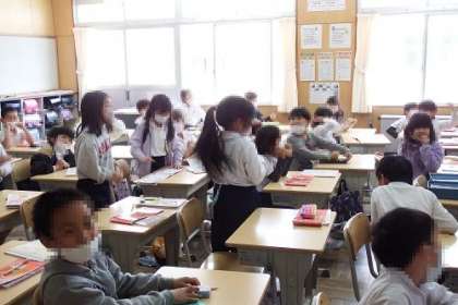 写真は、先生についてのクイズを行っているところの様子です。子どもたちが質問を考え、先生が〇×で答えていきます。答えをぴったり言い当ててしまう子もいて、みんなびっくり。
