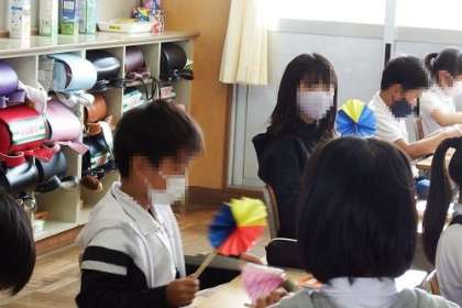 算数「角とその大きさ」の学習に入る前に、おうぎを作りました。柄の部分を操作することで扇の角度を変えられます。丸い形の扇子にもなります。これから角の大きさの学習に利用していきます。