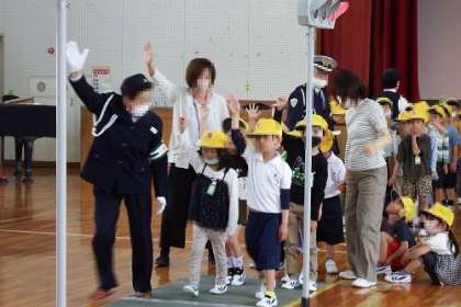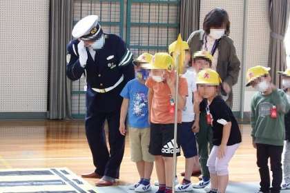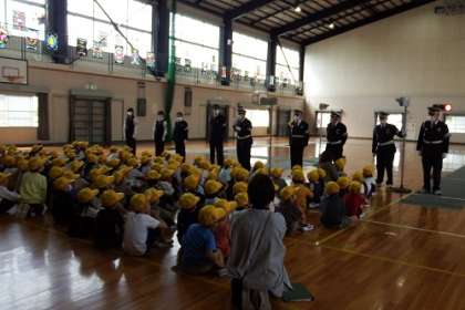今までコロナのため実施できなかった1年生の交通安全教室を本年度は実施することができました。講師の方のお話をよく聞いて、道の渡り方(右を見て、左を見て、もう一度右を見て)や雨の日の安全な傘のさし方を教えていただきました。ありがとうございました。