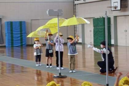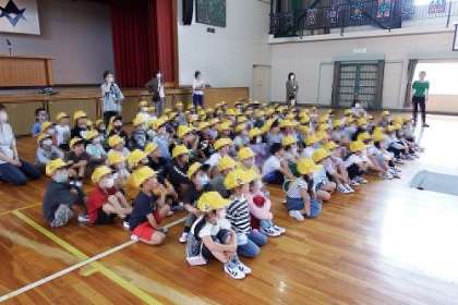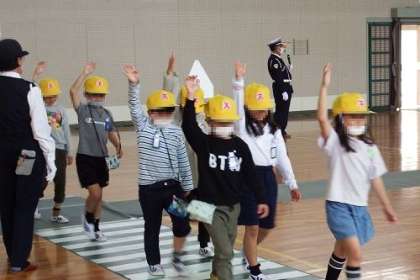 今までコロナのため実施できなかった1年生の交通安全教室を本年度は実施することができました。講師の方のお話をよく聞いて、道の渡り方(右を見て、左を見て、もう一度右を見て)や雨の日の安全な傘のさし方を教えていただきました。ありがとうございました。