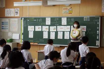 算数「時こくと時間」の学習で、午前と午後について学びました。24時間が午前と午後に分かれるとことをふまえて、時間を考えます。