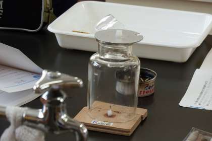 理科「ものの燃え方」の学習で実験を行いました。ろうそくをびんの中で燃やす時に、底にすき間をつくると、ろうそくの炎はどのようになるのだろうか。びんの中でものが燃え続けるには、空気が入れ替わる必要があることが分かった。