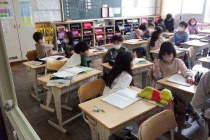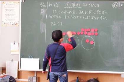 算数で「わり算」の学習に入りました。この日は、24このあめを3人に同じ数ずつ分けると1人分は何こになるかという問題に取り組みました。最初はおはじきを使って、次に、おはじきを使わないで考えました。