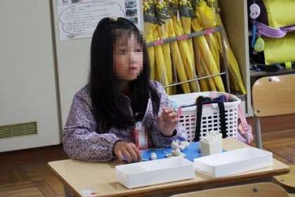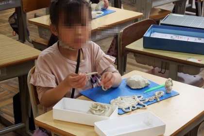 図工で「ねんどのなかよくなろう」に取り組みました。あぶらねん土を使いました。丸い形にしてだんごをつくったり、細長くしてへびをつくったり。イメージの世界を広げました。