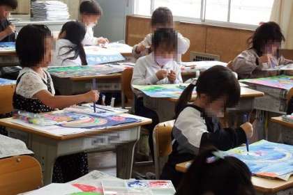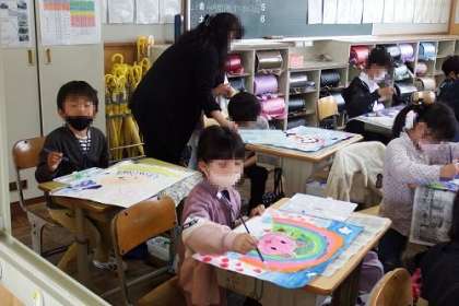 図工「ふしぎなたまご」の絵に色付けが進んでいます。色鮮やかな絵ができあがりました。心がうきうきしそうです。
