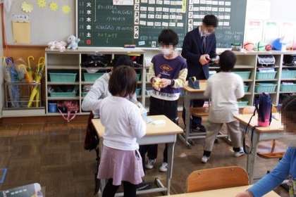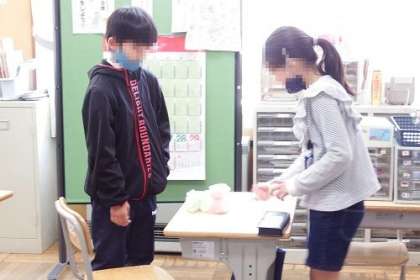 図工「ふわふわスポンジボールをつくろう」の学習に取り組みました。3つのスポンジをあわせ切り込みをいれます。ふわふわなボールができあがりました。手でついたり、ボールをぶつけたりしながら楽しく遊びました。