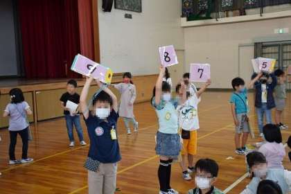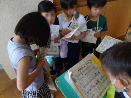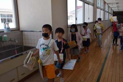 1・2年生が「学校たんけん」を行いました。この日に向け、2年生は学校の教室を下見し、どの教室をどう紹介するのか考え、準備してきました。体育館に1年生を迎え、さあ、出発です。