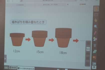 レンガの数と全体の高さの関係や植木鉢の数と全体の高さの関係を使って、「比例」の学習の導入を行いました。それぞれ2つの数量の間には、どんな関係があるのでしょうか。
