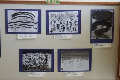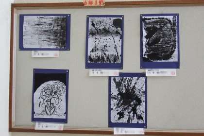 図工「墨と水から広がる世界」で取り組んだ作品が学年掲示板に掲示されています。まるで水墨画の世界のように黒と白の世界が広がっています。