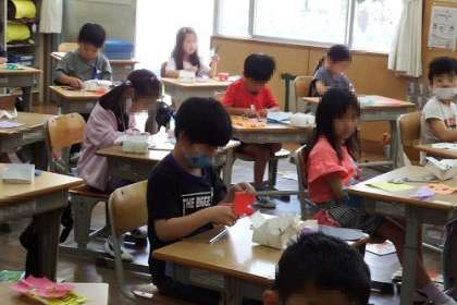 図工「ちょきちょきかざり」の学習を行いました。色紙を折って、いろいろな形を切り抜きます。すると・・・。思いがけないような素敵な形がたくさん。