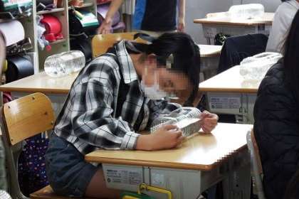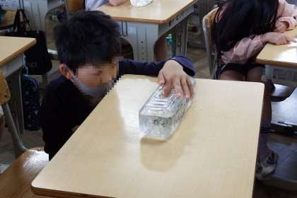 理科の学習で観察するメダカが、子どもたちのもとにやってきました。各学級でメダカが配られ、子どもたちのペットボトル水そうで元気に泳いでいます。メダカを一生懸命に観察している子どもたちです。