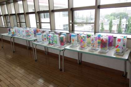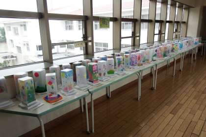 6年生が図工で作った「ランプシェード」を、渡りに展示しました。きれいに並べられた四角いランプが、廊下を歩く人の目を楽しませてくれています。