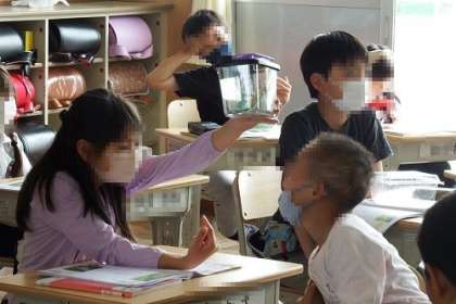 理科「こん虫の育ち方」の学習に取り組みました。学級園で、チョウの卵を見つけた子どもたち。教室にもどっても気になって。虫かごに入れたキャベツノの葉についた卵を、一生懸命に観察していました。