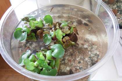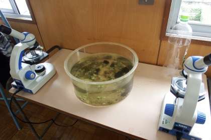 今、広場には子どもたちのペットボトル水槽がいっぱいです。その中では、メダカたちがすいすい泳いでいます。その他にも、写真にあるような水槽が置かれています。また、観察用の顕微鏡も。