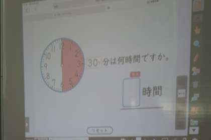 分数の学習で、分数で表された時間について考えました。「30分は何時間ですか」時計の図を使って、話し合いを進めました。