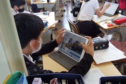社会科「低い土地のくらし」で、岐阜県海津市を例に、その土地の人々がどのような工夫をしながら生活をしているのか学びました。タブレットを使いながら調べ学習を行っています。