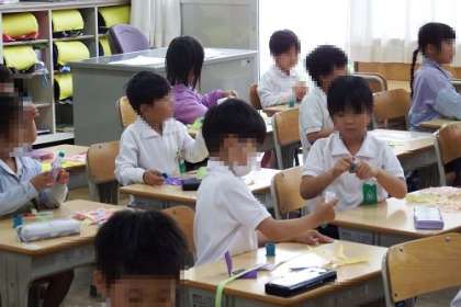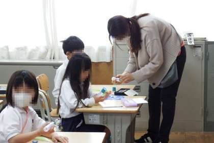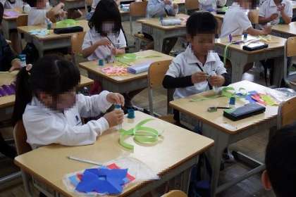 図工「ちょきちょきかざりをつくろう」では、色紙を折ってハサミで切り抜き、飾りをつくりました。さらに、紙テープにのりで飾り付け完成です。様々な模様や形のちょきちょき飾りができあがりました。