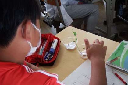 理科「植物の発芽と成長」で、発芽の条件を学習しました。インゲンマメの実験から、発芽には水が必要であることが分かりましたそれでは、水の他に空気や温度は・・・。