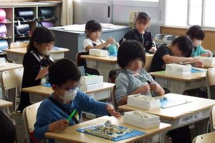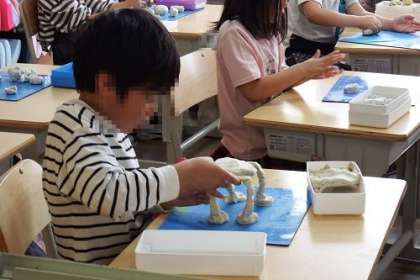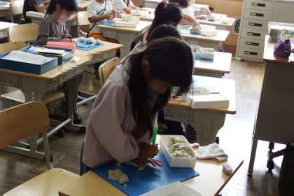 写真は、図工「にぎにぎねんど」の学習の様子です。大きなねん土を体重をかけてこねている子、小さなねん土は、指の先で転がしながら細かく形を整えている子。みんな集中して取り組んでいました。ねん土は不思議な教材です。